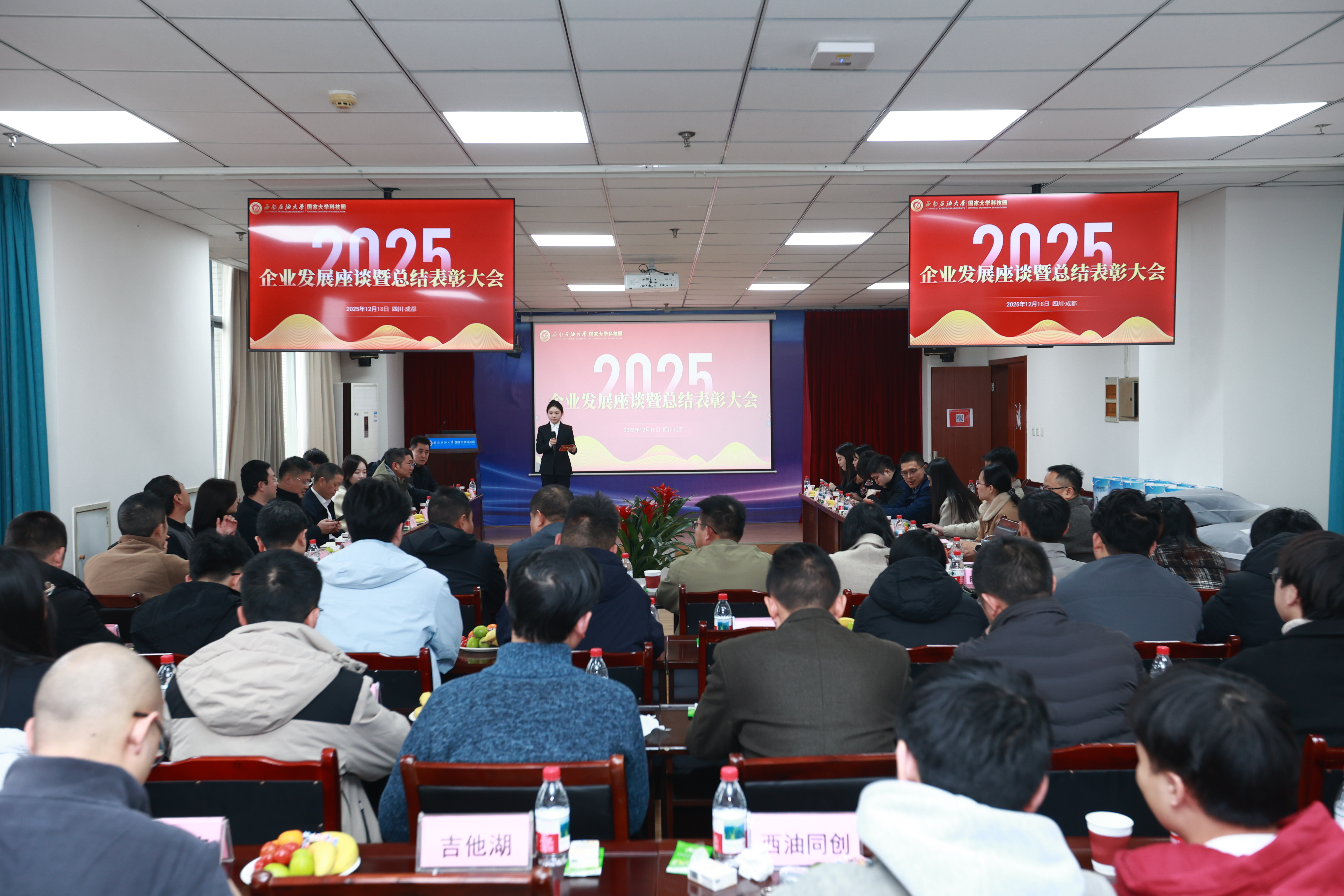 12月18日下午,西南石油大学国家大学科技园企业发展座谈暨2025年度总结表彰大会在科技园大厦502会议室隆重举行,旨在总结2025年科技园发展成效,表彰优秀企业,凝聚发展共识。科技园管理办公室主任李勇明、富润教科党委委员、副总经理、工会主席李灿,资产公司党委书记姚富云,富润教科党委委员、副总经理肖仙雄、资产公司负责人肖生超、新都区新经济和科技局副局长卓佳,新都街道办事处副主任彭艳霞、科技园公司总经理关小旭,区人社局、学校党政办公室、国资处、工商银行及园区50余家企业代表出席会议。